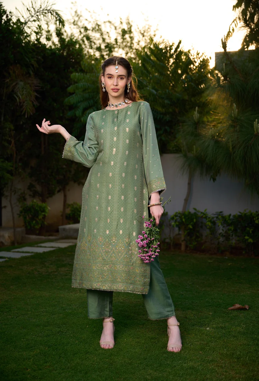 Featuring a olive green vegan silk kurta set with vertical woven strips in crisscross and floral patterns.It is paired with woven dupatta in a fish-scale pattern and plain pants.