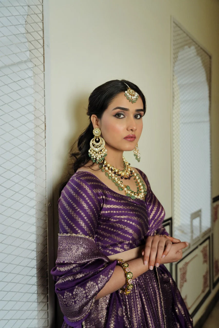 Featuring, a purple monotone self woven lehenga. The crop top has diagonal weaves with a border on the hem of the sleeves. The skirt has horizontal weaves with a geometrical pattern at the lower half. The dupatta has a stripes with a thick border on four sides.