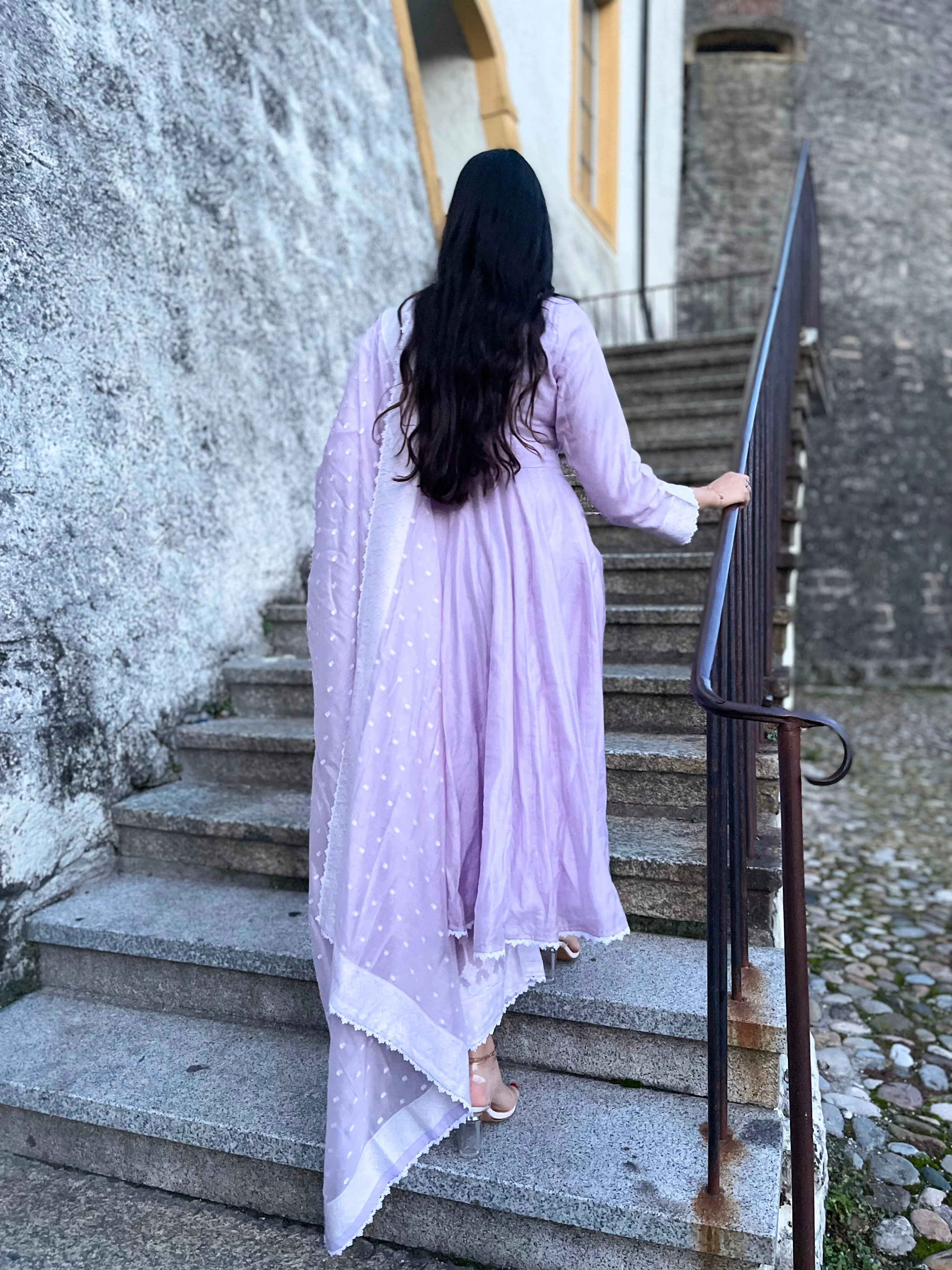 Featuring , a lilac woven anarkali in vegan silk. The Anarkali shirt has woven broad kurta patti neck paired with thick bordered pants and matching light motif spread dupatta with four side border.