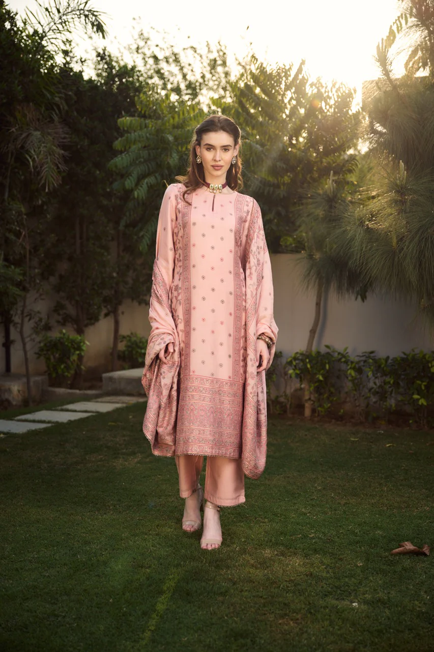 Featuring a pink peach kurta set in vegan silk base with woven kantha and booti work and a thick kanthakari pattern border It is paired with a matching dupatta and plain pants.
