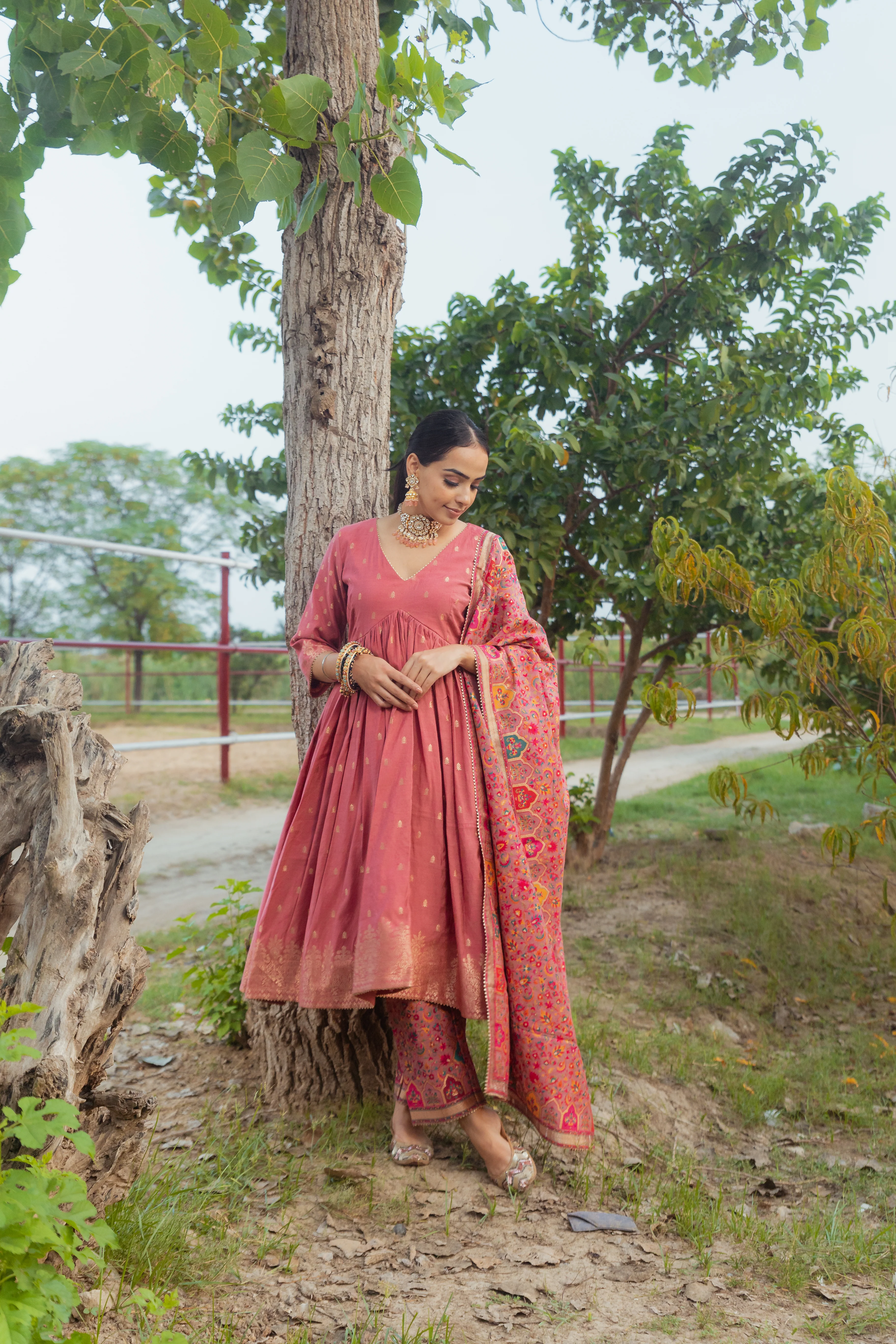 Featuring, a rouge pink anarkali suit in pure moonga silk. The shirt has a light spread over all with thick border on the shirt's hem and sleeves. The set features a kani weave dupatta and pants. The dupatta has a four sided border.