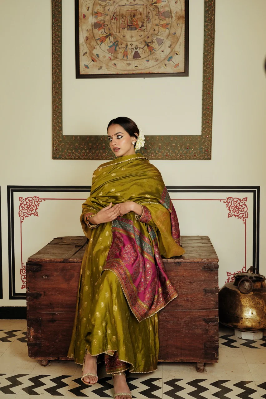 Featuring, a lime green self woven long anarkali with a motif spread all over. The monotone anarkali is paired with coordinating pants with a border on the hem. The set comes with a matching dupatta with a very thick border on the two sides.
