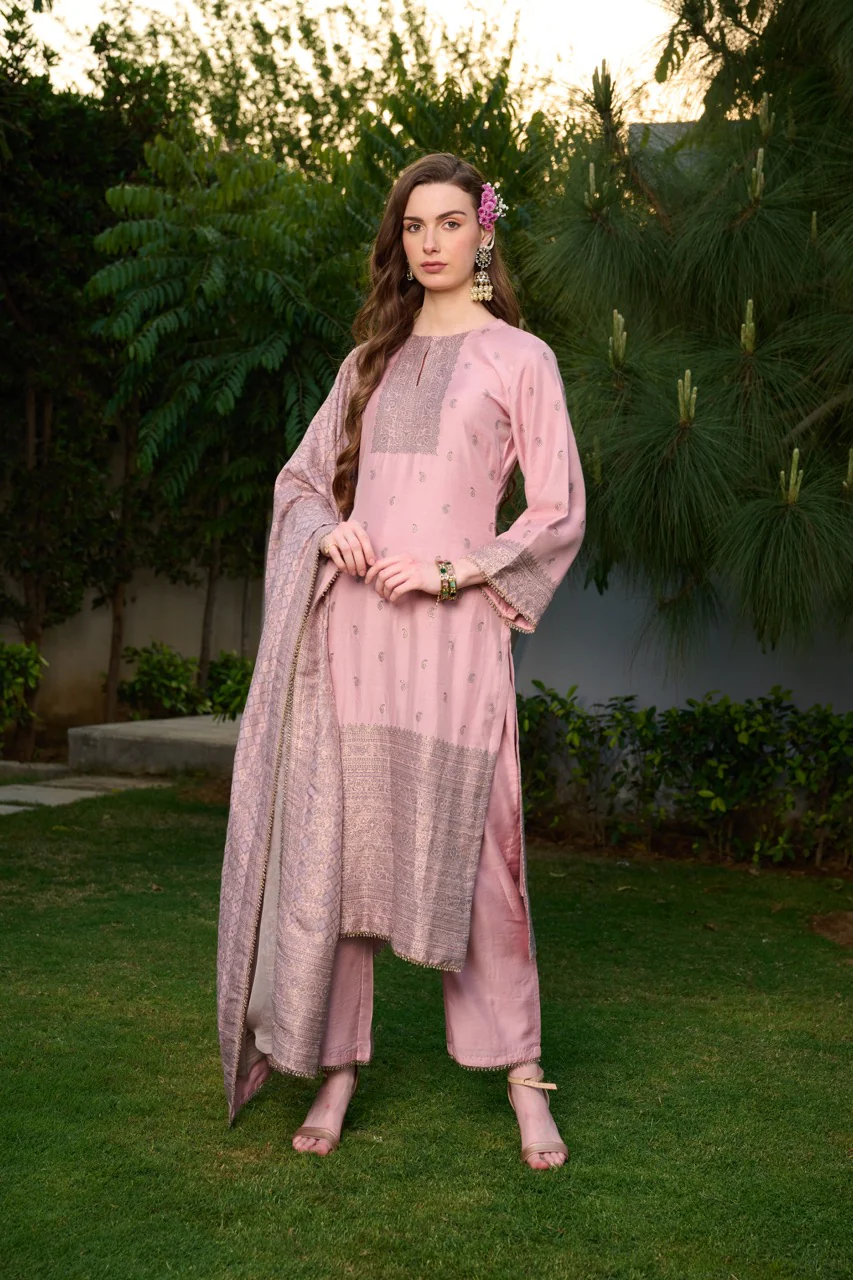 Featuring pink vegan silk kurta set with woven paisley pattern throughout, kurta patti neck and a thick border detailing. It comes with a woven dupatta in a crisscross pattern mixed with paisley, floral booti and plain pants.