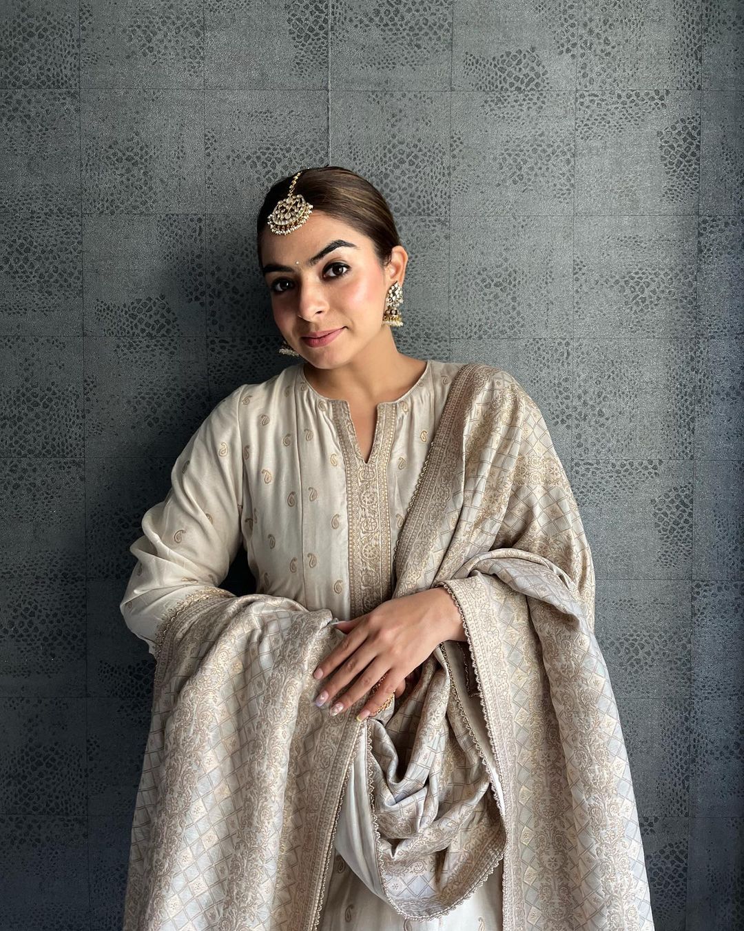 The Eaj Suit is a blissful combination of ivory and gold. The kali shirt has woven paisley pattern throughout with a thick border on the ghera. The set comes with a rich, heavy woven dupatta in a crisscross pattern mixed with paisley and floral booties.the ivory hued suit comes with straight pants with matching border.