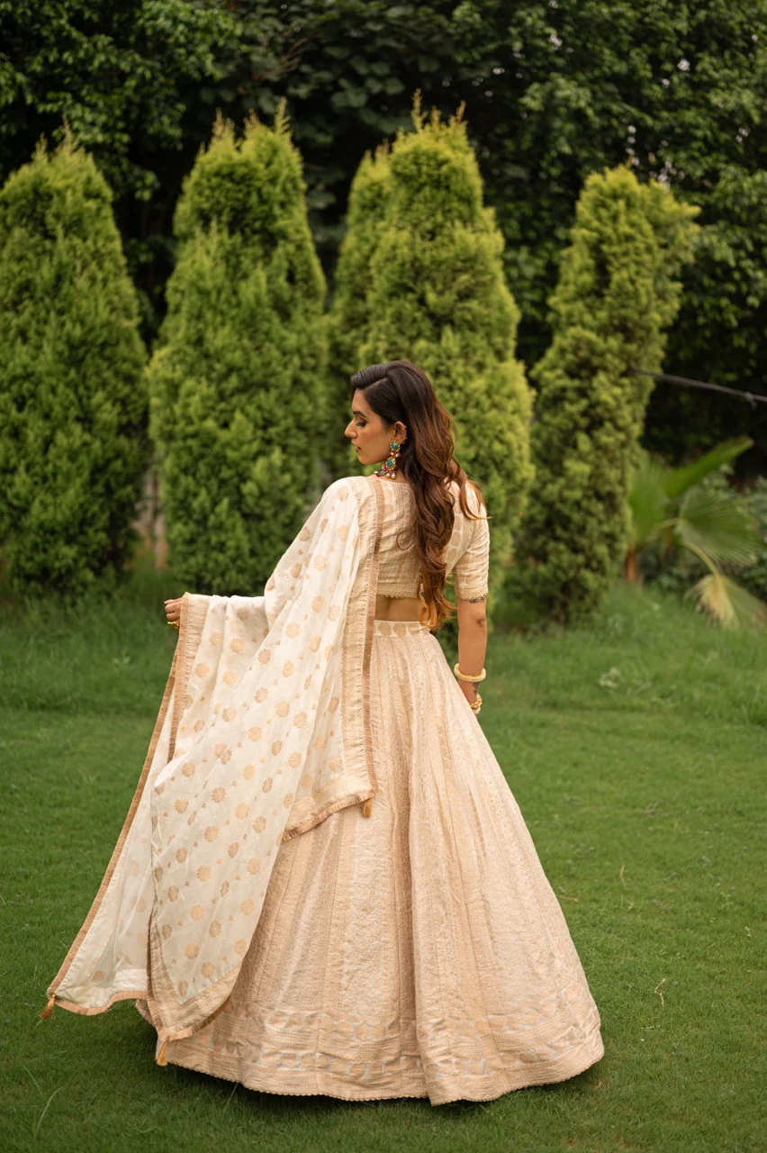 Discover sheer opulence with our Woven Pearl White Lehenga, meticulously handcrafted from luxurious vegan silk, adorned with delicate Chikankari design. The lehenga has vertical strips woven in beautiful patterns and paisley motifs with a thick border on the ghera. It is paired with a co-ordinating blouse with floral motifs and a matching dupatta. The soothing off-white hue exudes sophistication, while the intricate Kashmiri zari work adds a touch of regal charm. Perfect for grand celebrations and cherished occasions.