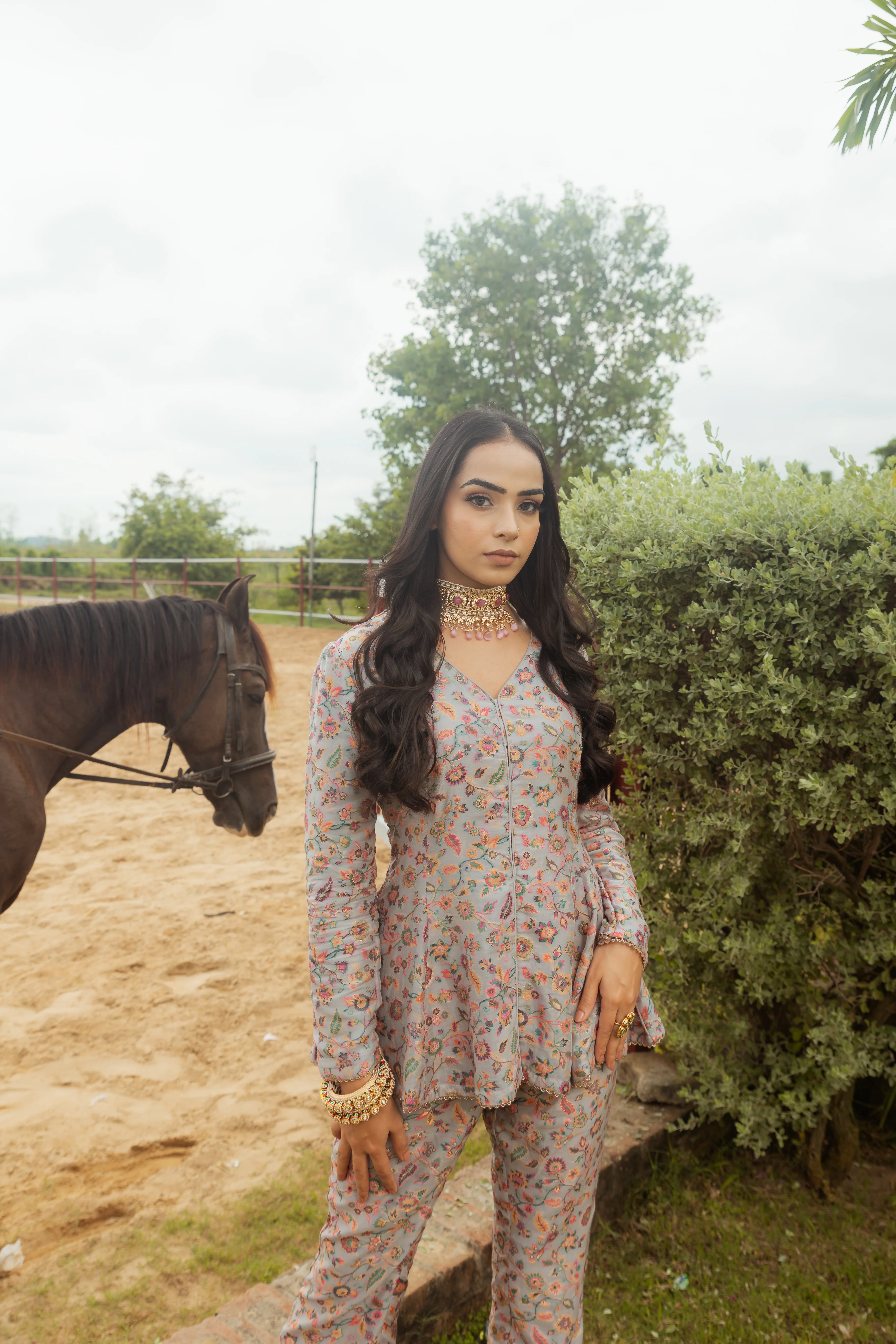 Featuring, a gray-hued floral weave co-ord set with blazer peplum top. The set comes with a co-ordinating pants with a border on the hems.